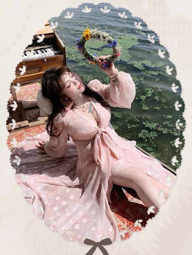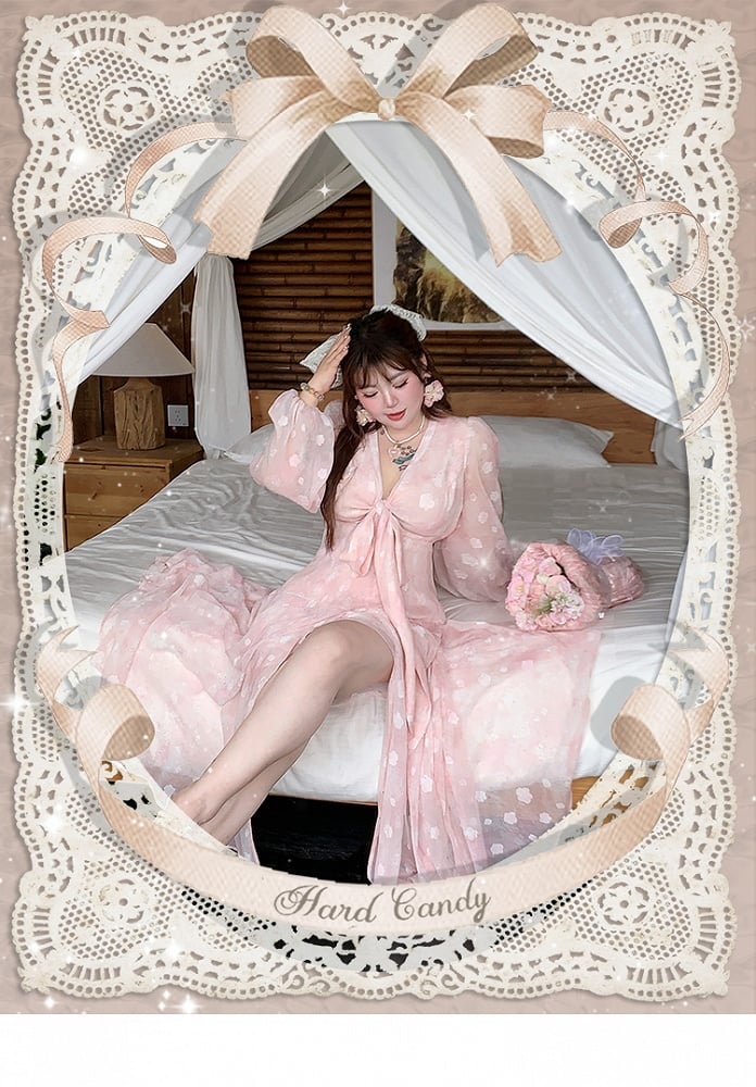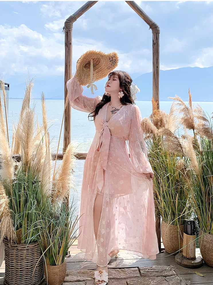 Embrace elegance and charm with this enchanting plus-size dress, featuring a delicate pink peach blossom print that exudes a sense of springtime romance. The self-tie bowknot front adds a playful yet sophisticated touch, allowing you to adjust the fit to your liking while enhancing your silhouette.