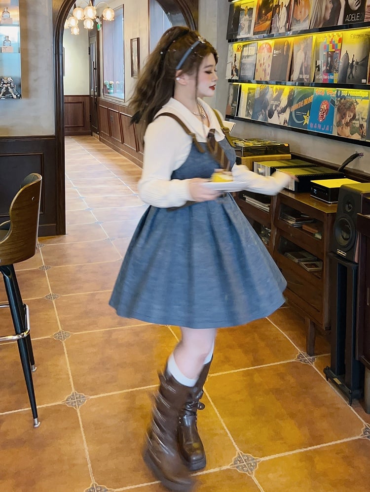 Plus Size White Shirt / Blue Denim Overalls Pleated Skirt