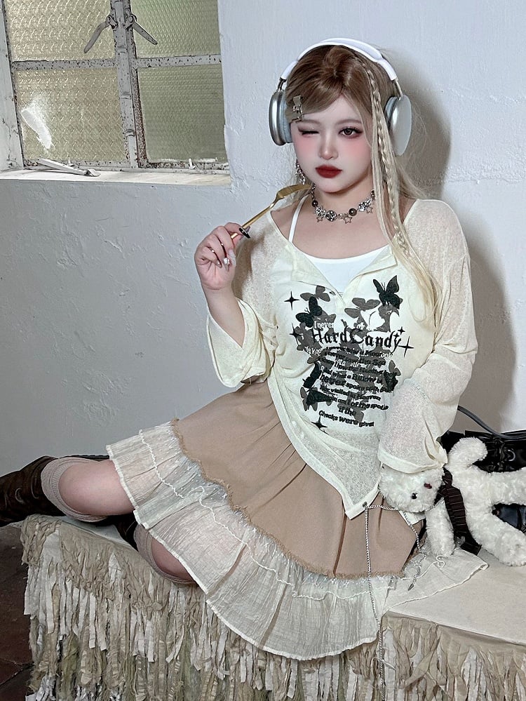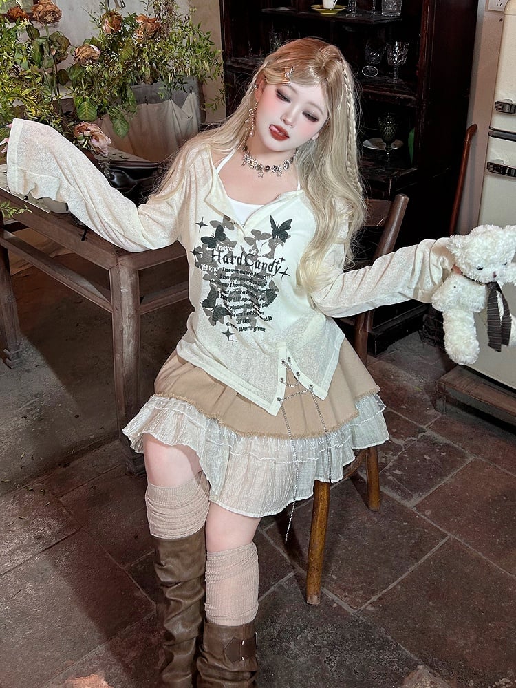 Elevate your Y2K-inspired wardrobe with our plus size white butterflies print top with chain and tank top set. This stunning ensemble features a long-sleeved top adorned with a charming butterfly print, exuding a nostalgic yet trendy vibe. The top comes with a delicate chain detail, adding a touch of edgy flair to your look. The set also includes a coordinating tank top for versatile styling options. Embrace your unique style and make a statement in this eye-catching ensemble. Perfect for pairing with your favorite high-waisted bottoms or layering under a pinafore dress. Embrace the Y2K aesthetic with this must-have set.