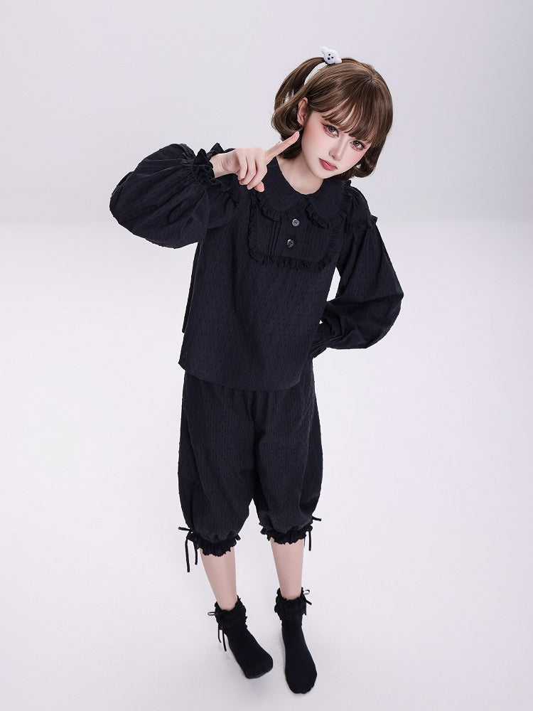 These pants feature a delicate scalloped eyelet trim that adds a playful yet sophisticated detail, perfect for those who appreciate the finer things in life. The elastic cuffs ensure a comfortable fit, making them ideal for cozy nights in or a Lolita-themed pajama party. With an accommodating elastic waistband, these pants offer both style and comfort for all body types. Embrace the enchanting world of Lolita fashion with this delightful addition to your wardrobe.