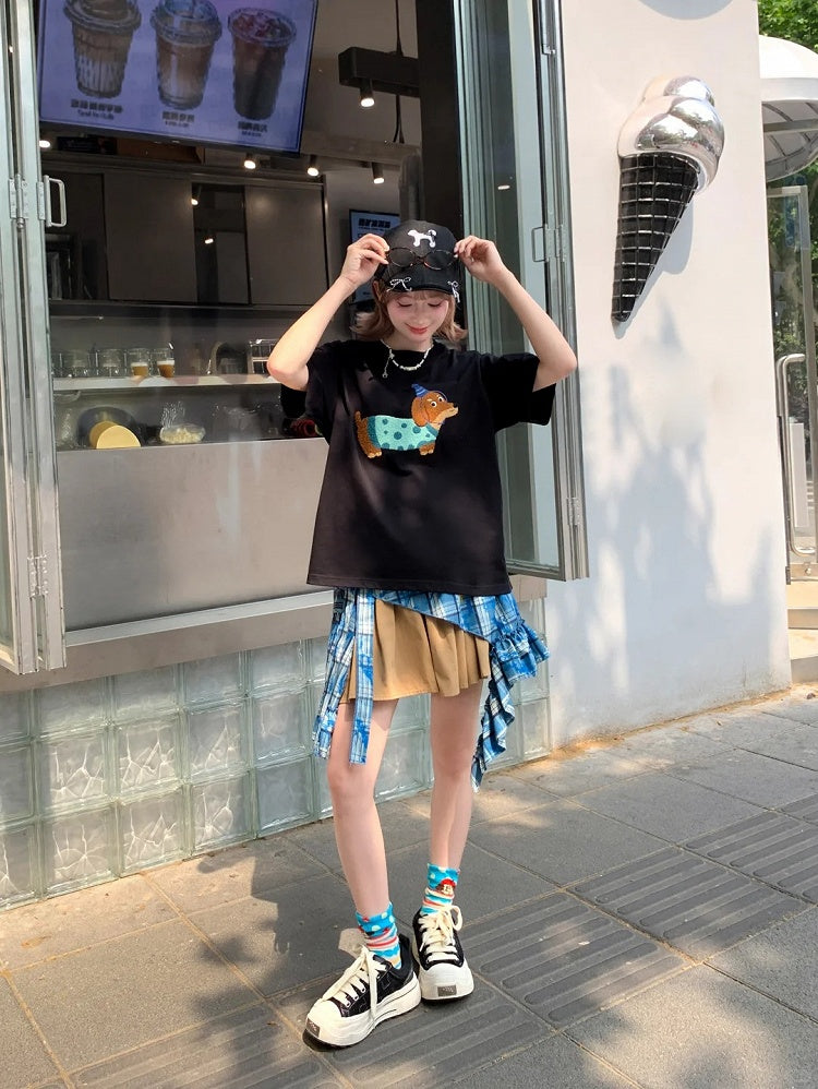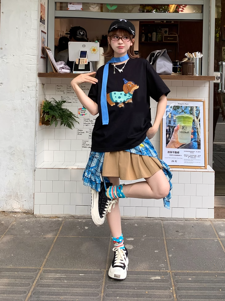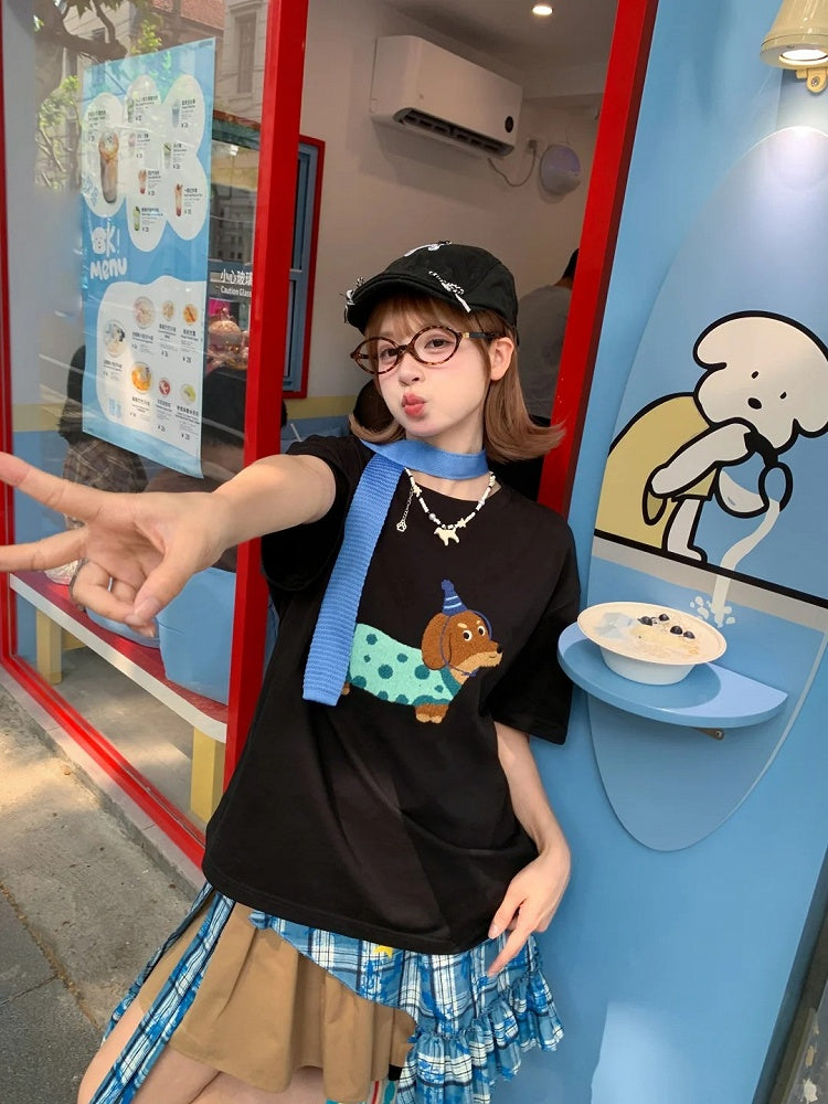 Plush Dachshund Embroidery Black Round Neck Cotton T-shirt