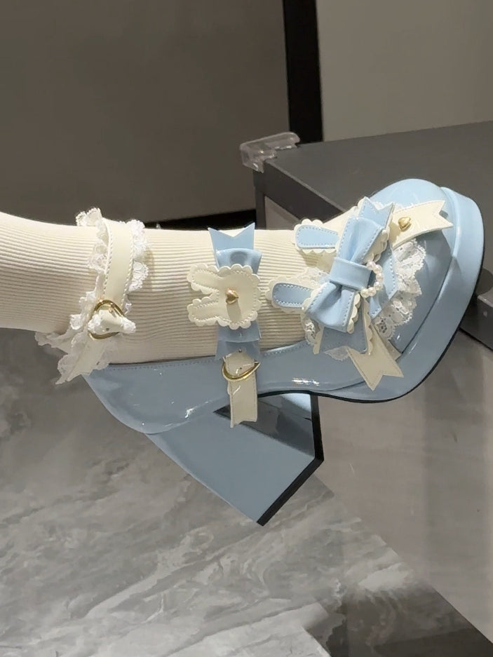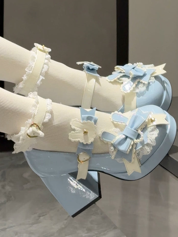 Polished Blue Sweet Lolita Bunny Decorated Bowknot Details Lace Trim Platform High Block Heels