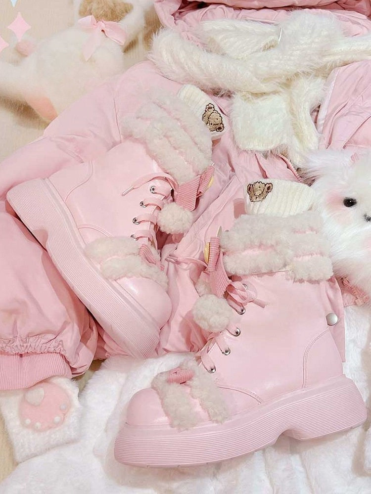 Step into a world of warmth and whimsy with these pink delightful shoes! Perfect for the cooler months, they boast a fleece-lined interior that promises cozy comfort with every step. The thick sole design not only adds a trendy touch but also provides excellent support and durability. Lace-up details ensure a snug fit while adding a classic charm. Adorned with playful bows and plush decorations, these shoes capture the essence of kawaii fashion, making them an irresistible addition to your wardrobe.