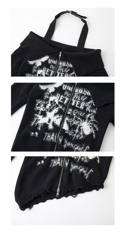 Unveil your unique style with this captivating knitted top, a perfect blend of edgy and chic. Featuring a distinctive halter neck combined with an off-the-shoulder design, this top offers a daring yet elegant silhouette. The cutout shoulder adds a touch of allure, while the asymmetrical design ensures you stand out from the crowd. A convenient zip closure provides a modern touch and easy wearability. Adorned with bold letters and a striking spider pattern on the front, this sweater is a statement piece that embodies both mystery and charm.