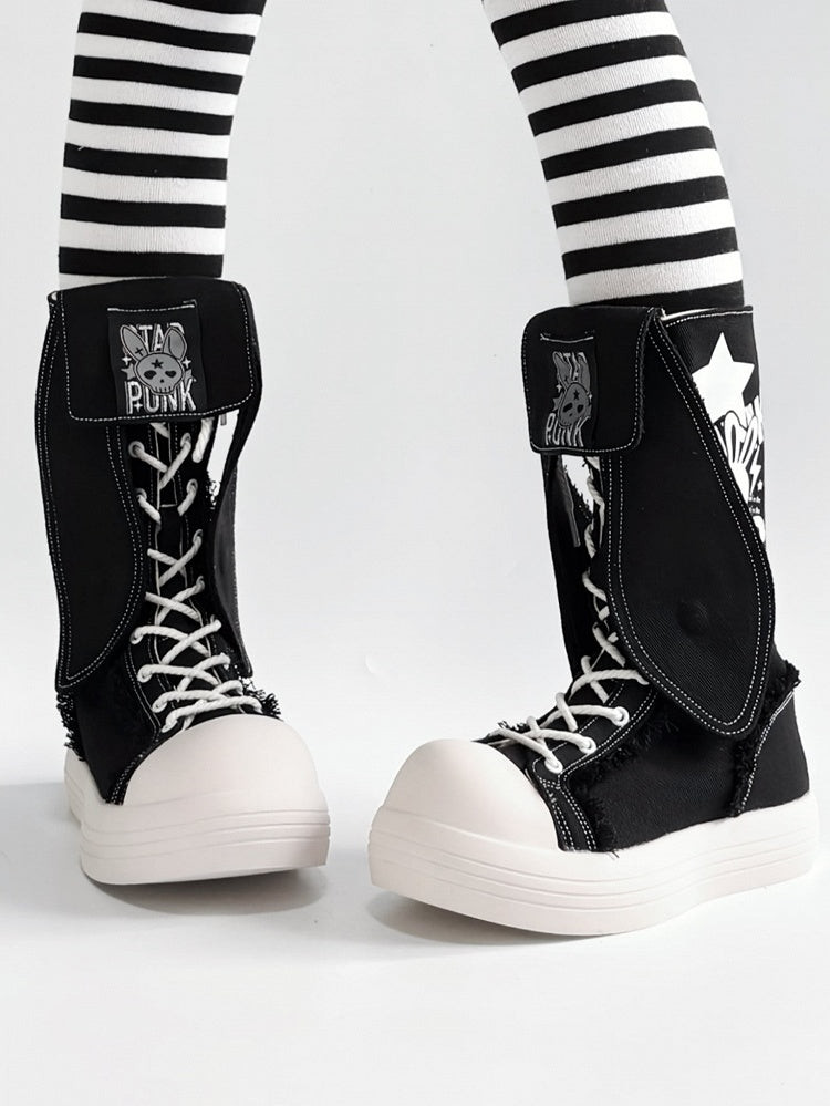 Punk Black Mid-Calf Boots - Bunny Ear Accents with Letter And Rabbit Print, Lace-Up & Inner Zip