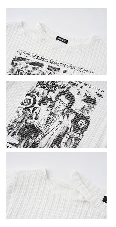 This round-neck tee brings a rebellious twist to your wardrobe with its unique one-sided cutout shoulder design. Perfect for making a bold statement, the shirt features striking punk-inspired prints that capture the essence of alternative fashion. Crafted for those who dare to stand out, this graphic T-shirt is a must-have for any fashion-forward individual looking.