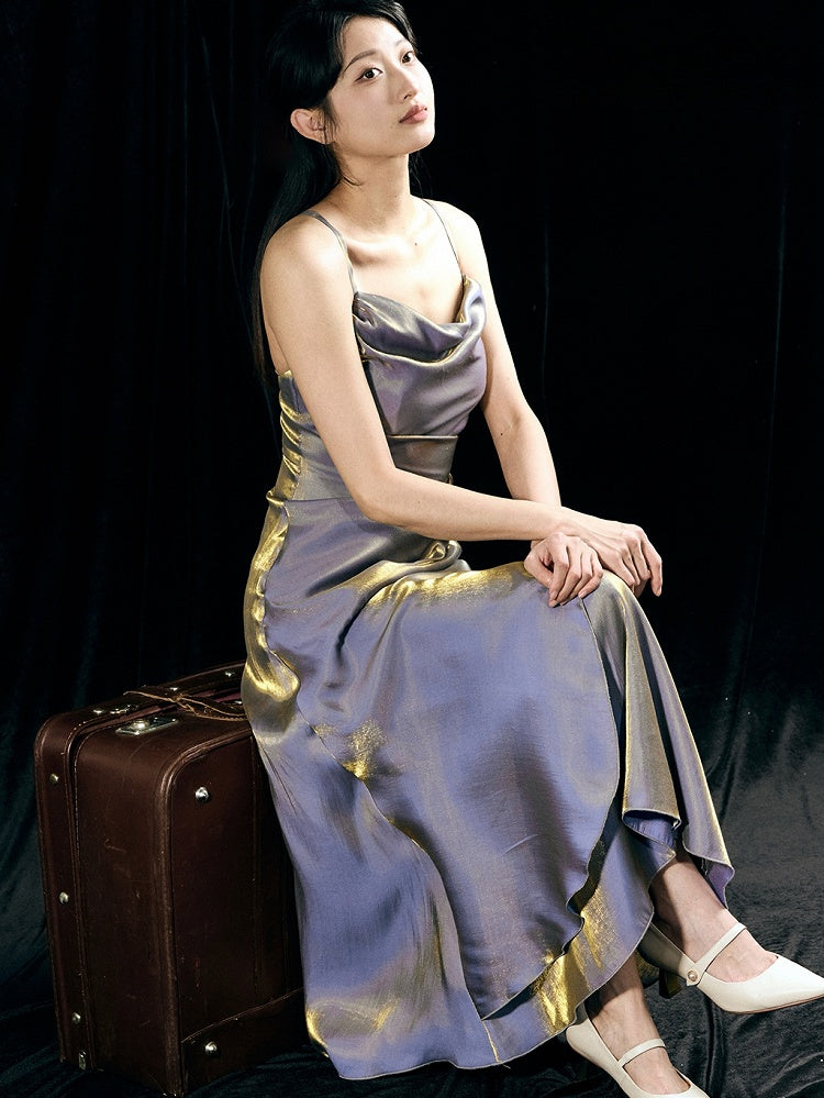 This exquisite dress features a cross-back design with adjustable shoulder straps, ensuring a perfect fit for every body type. The draped neckline beautifully reveals the collarbones, elongating the neck for a graceful silhouette. The waistline is accentuated with delicate pleats, creating a slimming effect that highlights your curves. The skirt is designed with an asymmetrical cut, adding a touch of sophistication and movement to your every step.Elevate your wardrobe with this versatile piece that seamlessly blends elegance and comfort. Perfect for any occasion, this dress is a must-have for those who appreciate fine details and impeccable design.