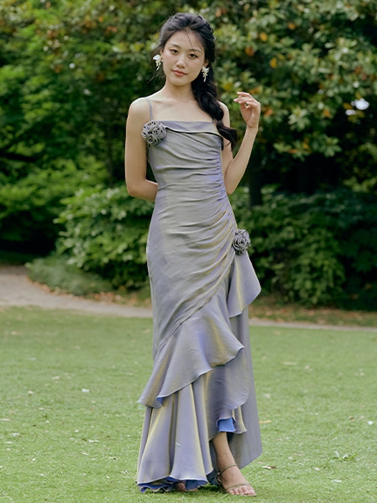 This dress features an irregular three-dimensional ruched design at the abdomen, perfectly concealing any tummy and creating a slimming effect. The hemline is crafted with a three-dimensional bias cut technique, adding a lively and charming sway to your movements. Adorned with floral decorations, this dress exudes a romantic and sweet allure.