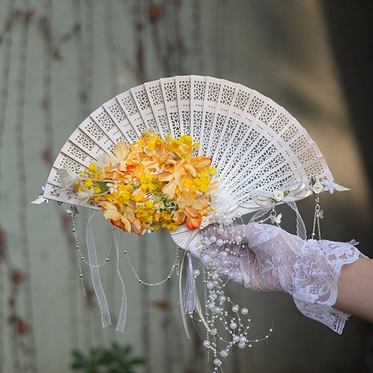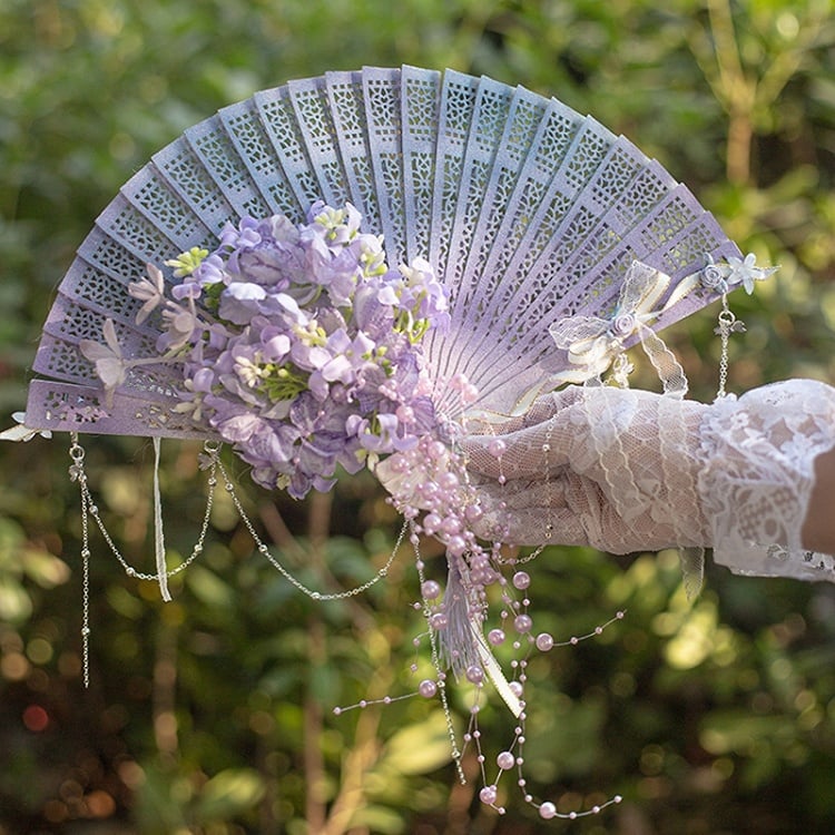Purple/Green/Pink/Yellow Beaded Charm Floral Design Folding Fan