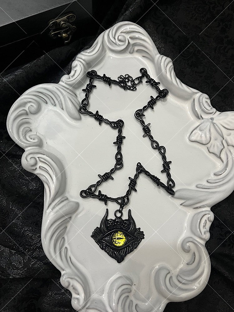 Embrace your gothic punk rock style with our Y2K-inspired demon eye thorn necklace. This unique and edgy choker features a striking design with thorny details, making it a perfect statement piece for your alternative fashion collection. The necklace is designed to accentuate your collarbones and add an extra touch of attitude to any outfit.