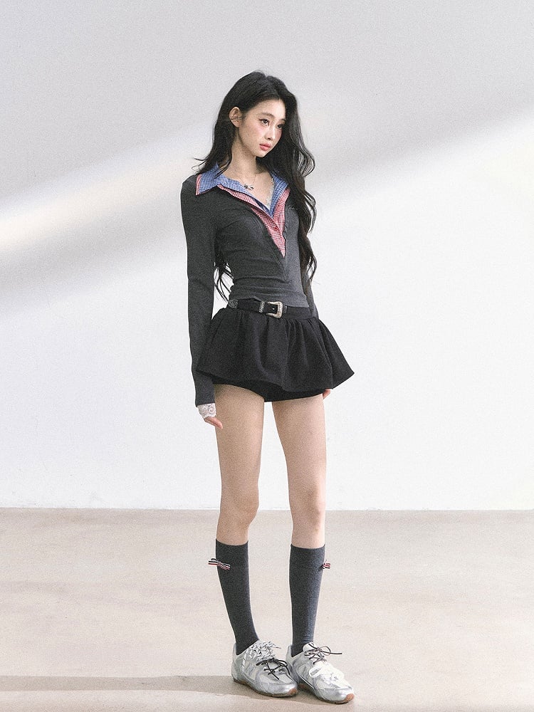 Elevate your style with this chic plaid collar gray top that masterfully combines the illusion of a layered outfit with the ease of a single piece. The classic plaid collar adds a touch of sophistication and preppy charm, perfect for both casual outings and more refined occasions.