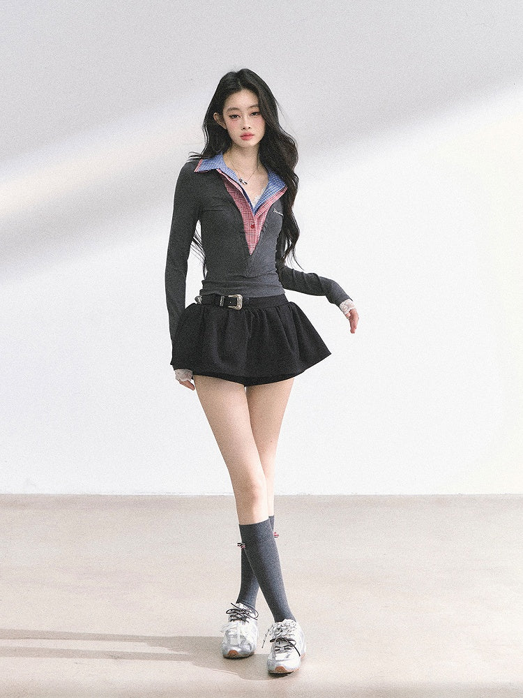 Red Plaid Collar Gray Slim-fitting Top Faux Two-pieces