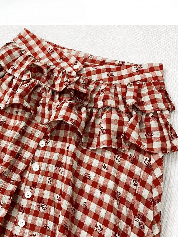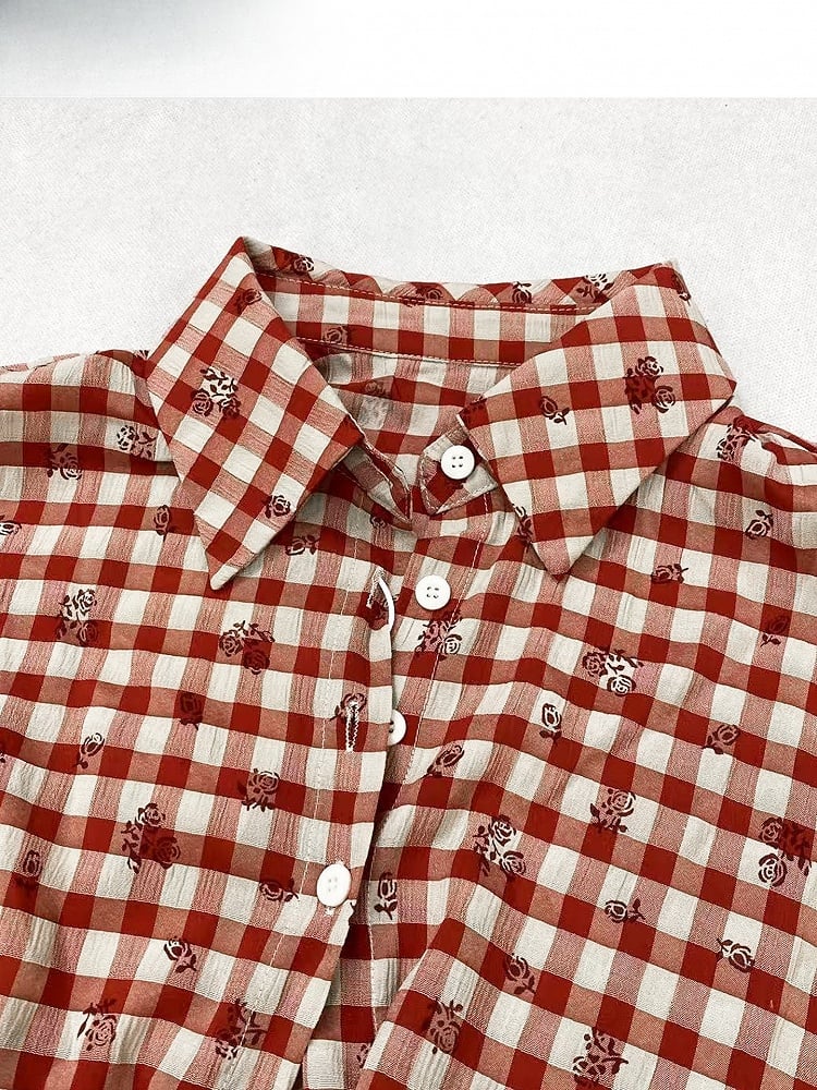 Red Plaid Pattern Floral Print Twist Details Shirt + Thigh-high Slit High-low Skirt