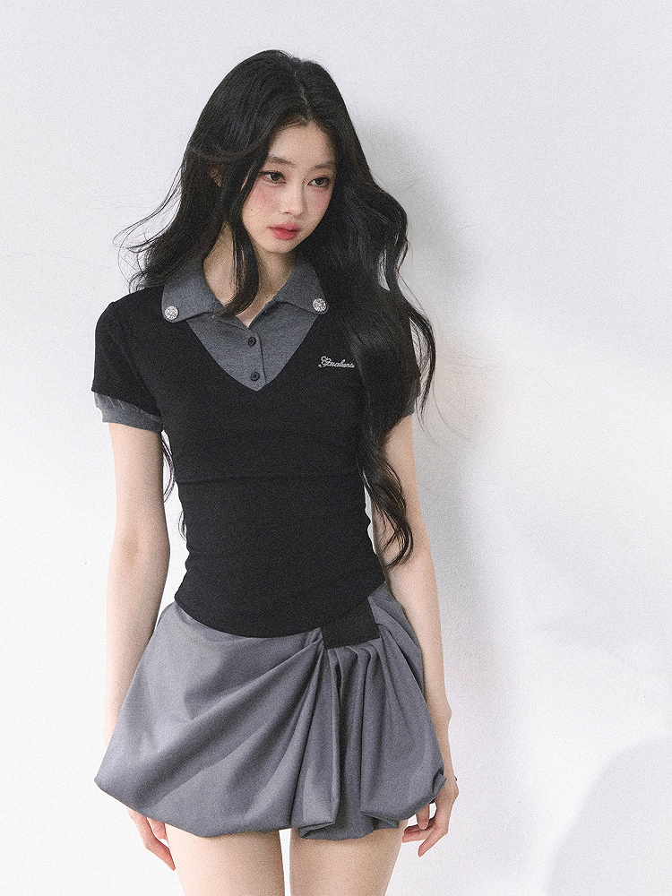 Rhinestones Decorated Polo Collar Pink& Apricot/ Black& Gray T-shirt Faux Two-pieces