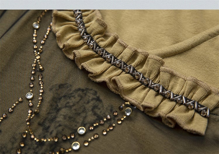 Rhinestones Decorated Yellow and Black Punk Rock Cross Print Asymmetrical T-shirt