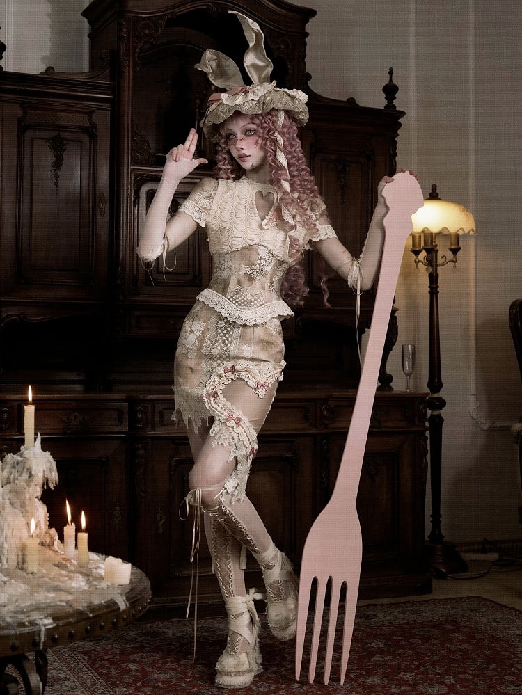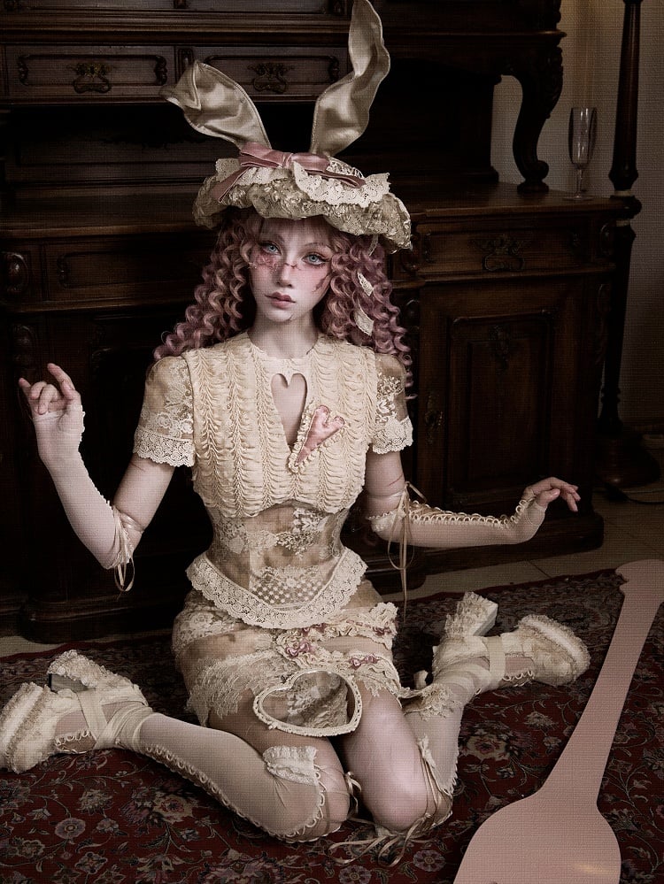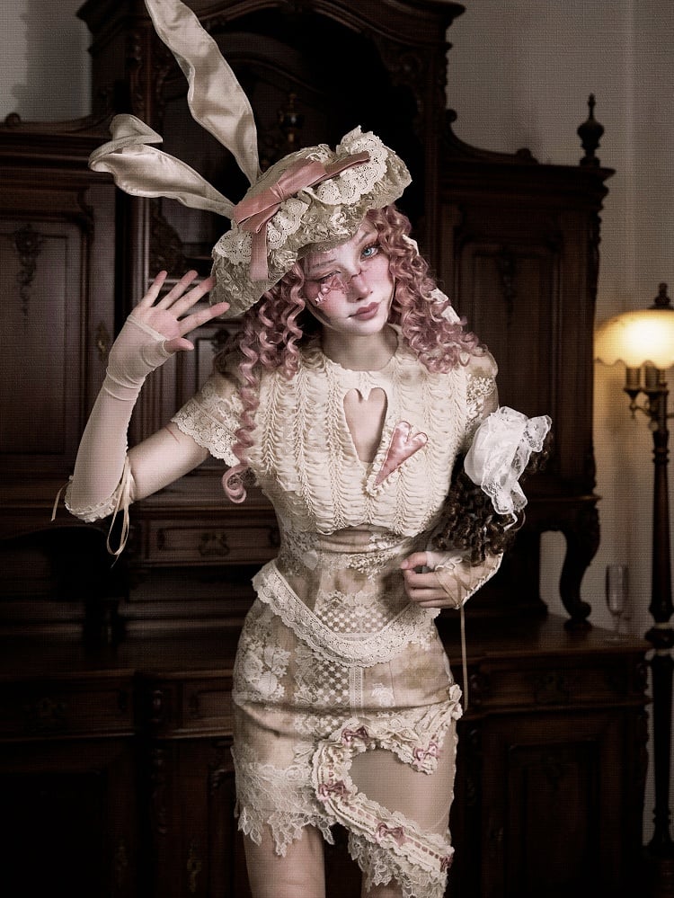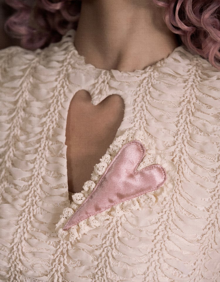 This enchanting piece features a heart-shaped cutout at the chest, a detachable pink heart adorns the side. The corset-style design cinches the waist, accentuating your silhouette, the back is crafted with elastic and a central back zipper ensures easy wear. The crochet lace trims at the sleeves and hem add a delicate, vintage-inspired touch.