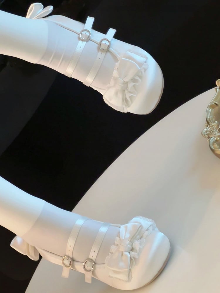 Step into a fairy tale with these white enchanting round-toe, low-heel Mary Janes. Crafted from a satin-like PU material, these shoes exude a delicate charm that’s perfect for any Lolita ensemble. Adorned with ruffled lace and whimsical bow accents, they capture the essence of sweet elegance. The dual buckle straps not only add a touch of vintage flair but also ensure a secure and comfortable fit.