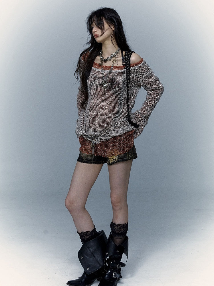 Shoulder Strap Design Punk Hollow Out Long Sleeves Top Beige/Brown/Orange