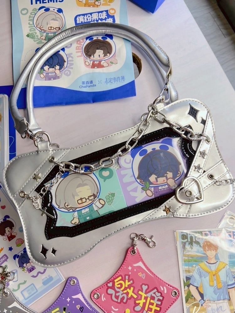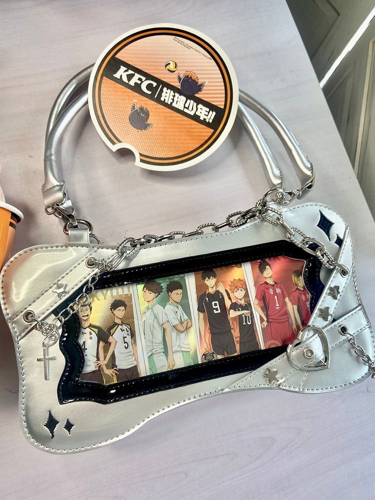 Unleash your edgy style with this uniquely designed bone-shaped bag, perfect for those who love to stand out. The bag features striking star-shaped stud embellishments that add a touch of celestial charm to its bold silhouette. A cross charm chain gracefully adorns the bag, offering an additional layer of gothic elegance. This statement piece is ideal for those who appreciate a blend of alternative fashion with a hint of celestial allure.
