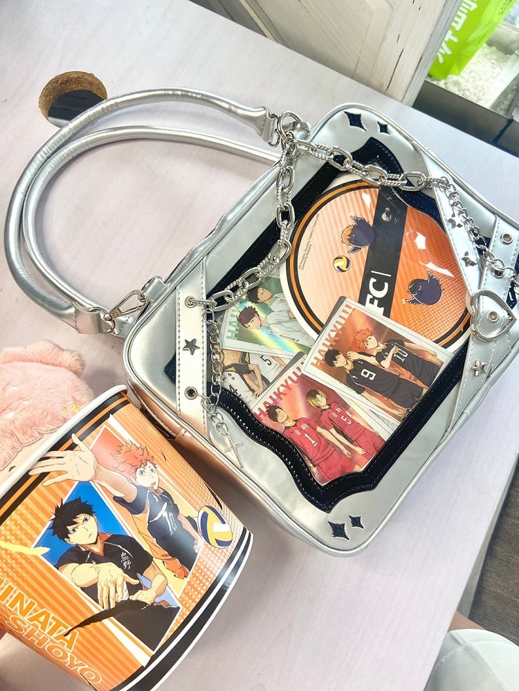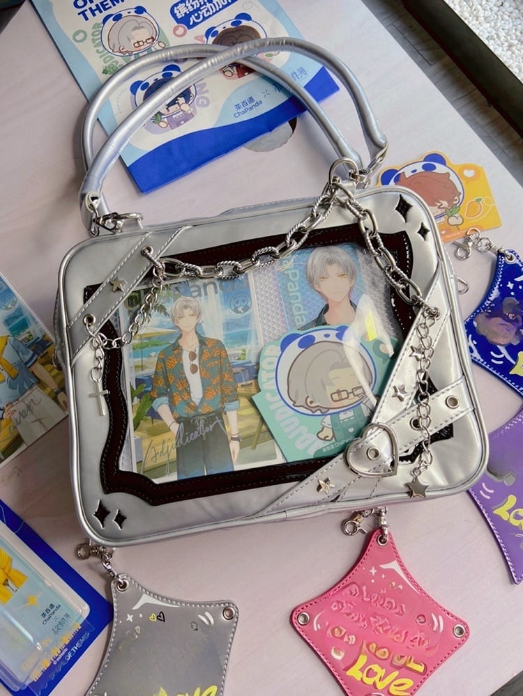 Introducing our Square Star-Studded Crossbody Bag, a perfect blend of celestial charm and edgy sophistication. This bag features a sleek square silhouette adorned with dazzling star-shaped studs that shimmer with every movement. The crossbody strap, designed for both style and comfort, showcases a unique criss-cross pattern embellished with adorable heart accents, adding a touch of whimsy to your ensemble. Completing the look is an elegant chain with a cross charm that dangles gracefully, offering a subtle gothic flair.Elevate your accessory game with this eye-catching piece that seamlessly combines kawaii and lolita fashion elements, making it a versatile addition to any wardrobe.