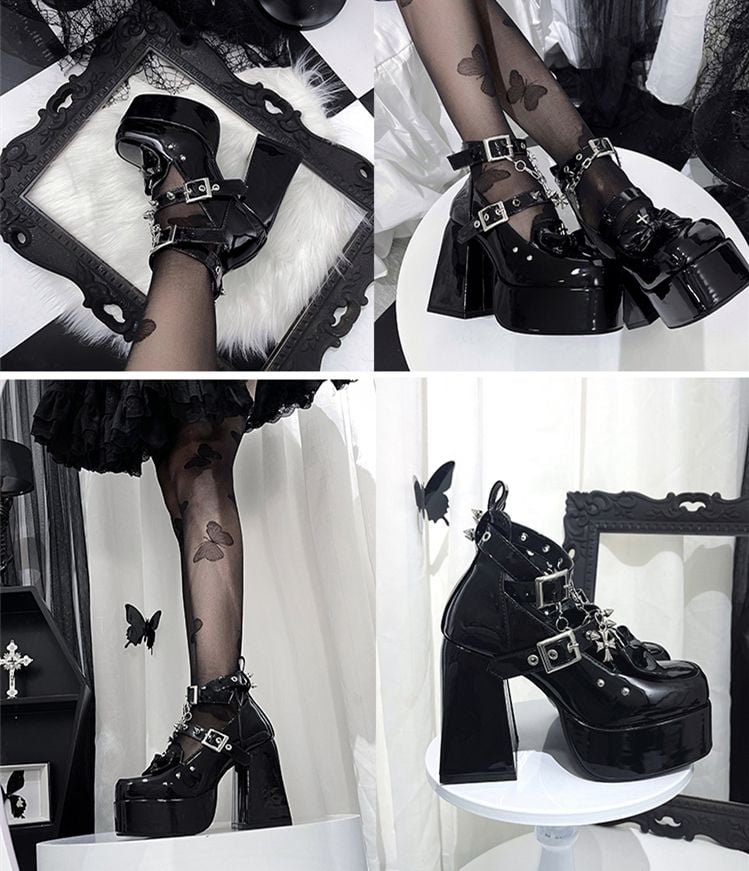 Spike Studs Polished Black Platform Block High Heels Punk Goth Shoes