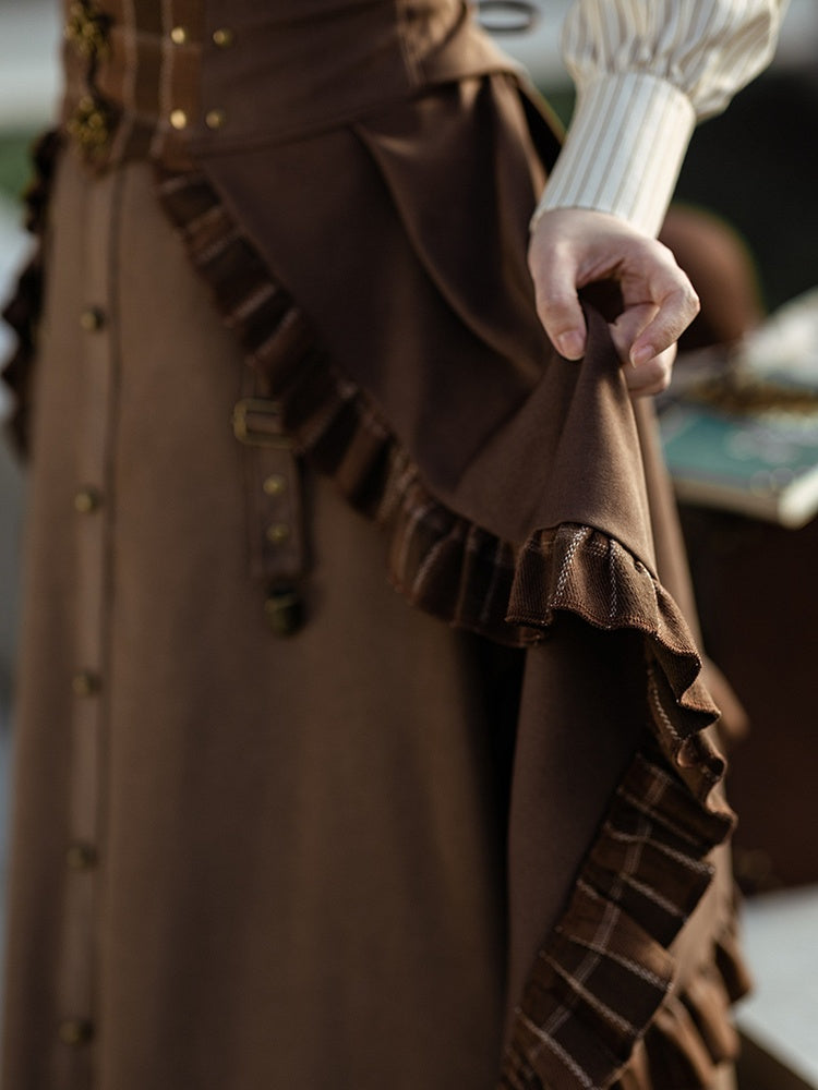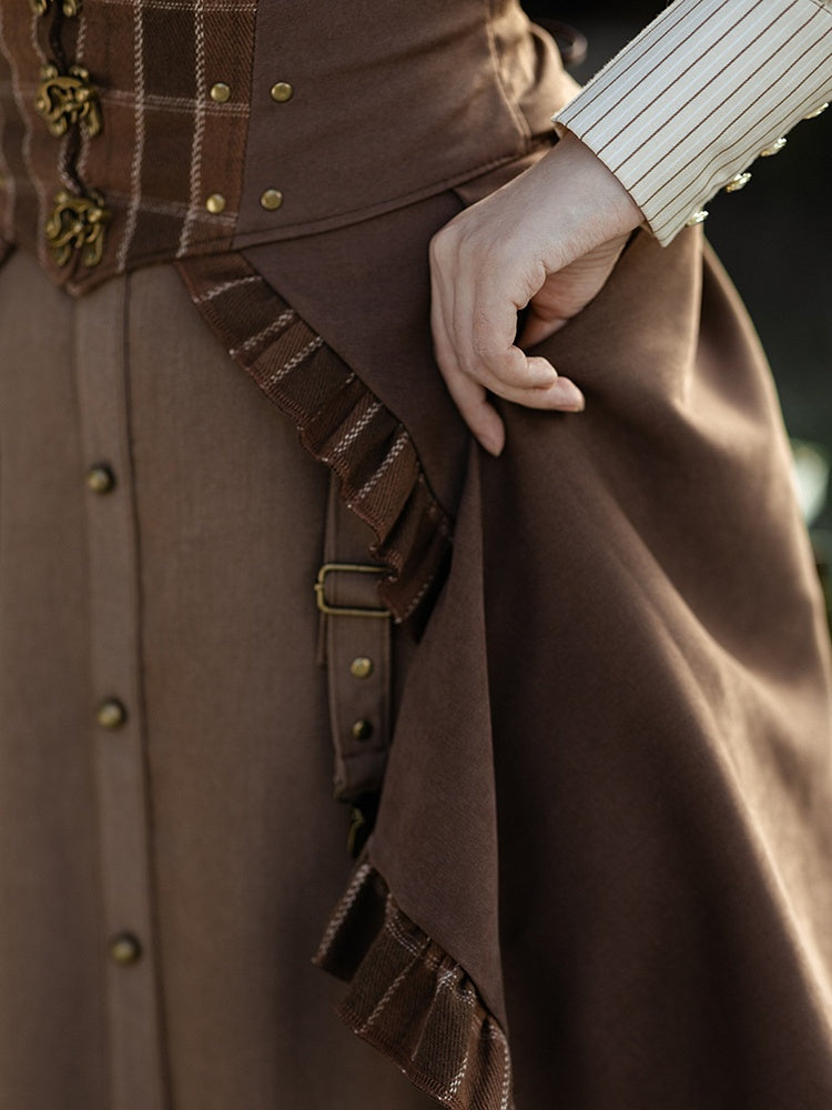 Steampunk Dark Brown Plaid Pattern Ruffled Hem Train