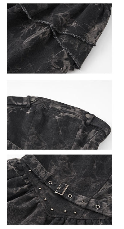 Elevate your style with this edgy strapless denim dress, crafted from a sophisticated black and grey denim fabric. The basque waist design accentuates your figure, while the buckle belt adds a touch of industrial chic. Eye-catching stud details bring a bold, modern flair to the piece. The tiered skirt offers a playful and feminine silhouette, perfect for twirling through your day. A hidden zip at the back ensures a seamless fit, combining functionality with fashion-forward aesthetics.