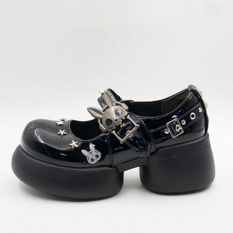 Studs Polished Black Platform Mary Janes with Skeleton Rabbit Buckles