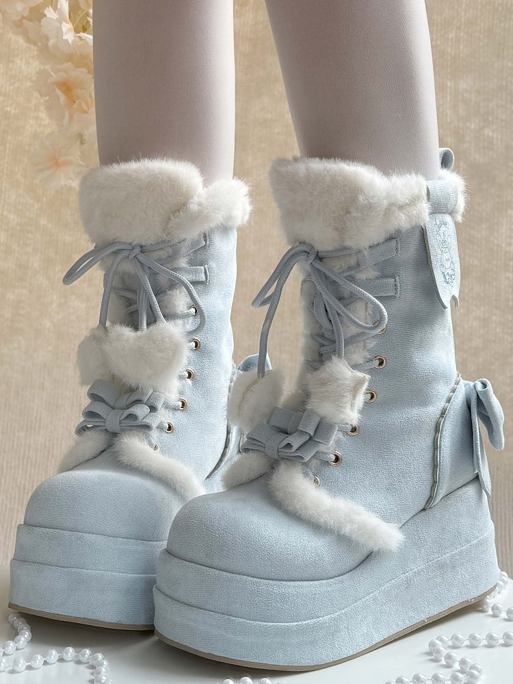Sweet Blue Snow Boots For Lolita - Plush Interior with Star & Heart Lace Charms & Delicate Bows