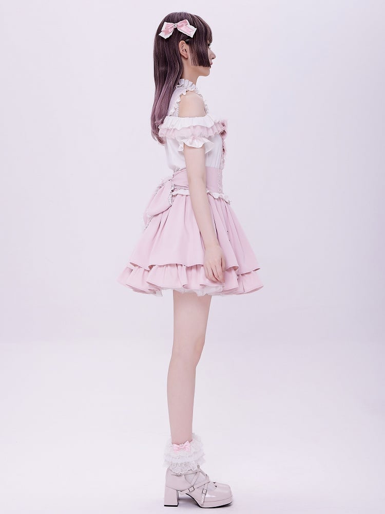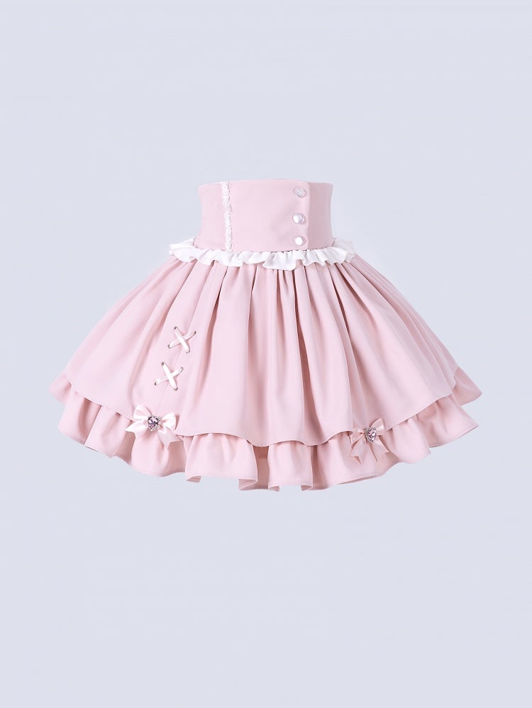 Sweet Pink Jirai Kei High Waist Layered Skirt Smocked Elastic and Self-tie Bow Back