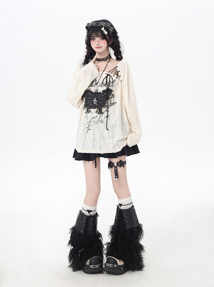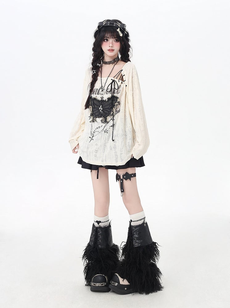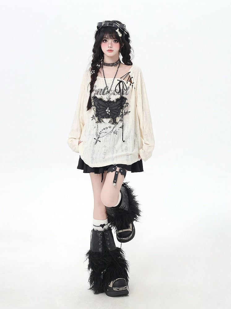 Vintage Butterfly Applique Lace-up Neckline Apricot Distressed Holes Top