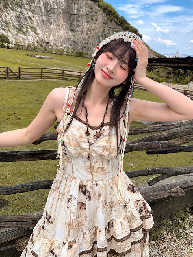 Vintage Butterfly Print Handkerchief Hem Apricot Tie Dye Spaghetti Strap Dress