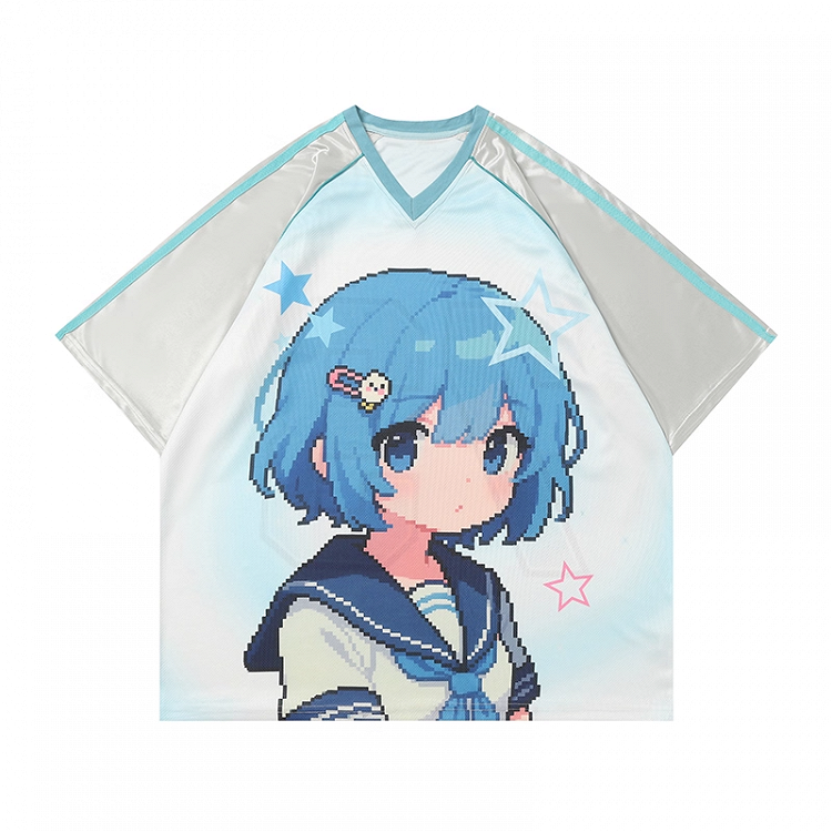 Embrace your playful side with this charming V-neck t-shirt, featuring an adorable cartoon girl print that adds a touch of whimsy to your everyday look.