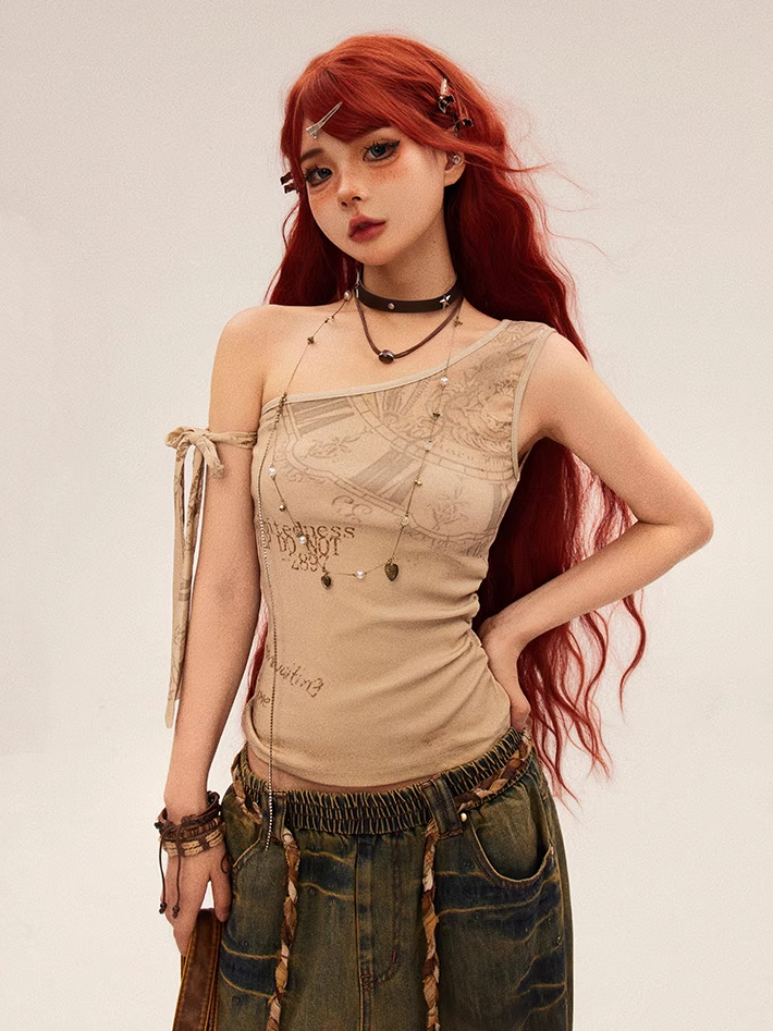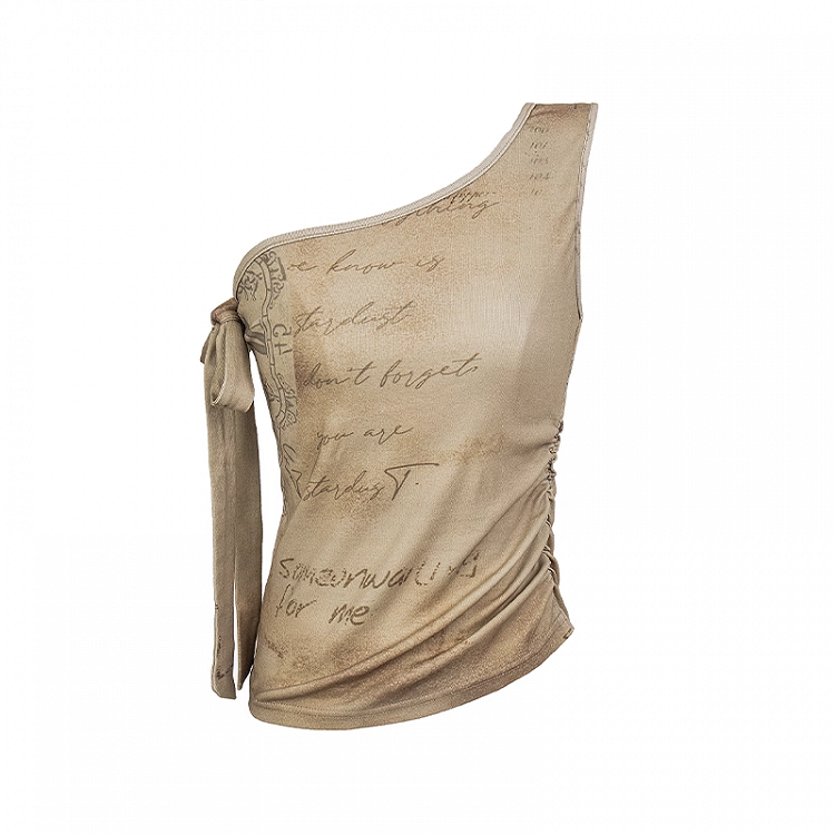 Vintage Graffiti Print Apricot Wasteland Punk Asymmetrical Neckline Top