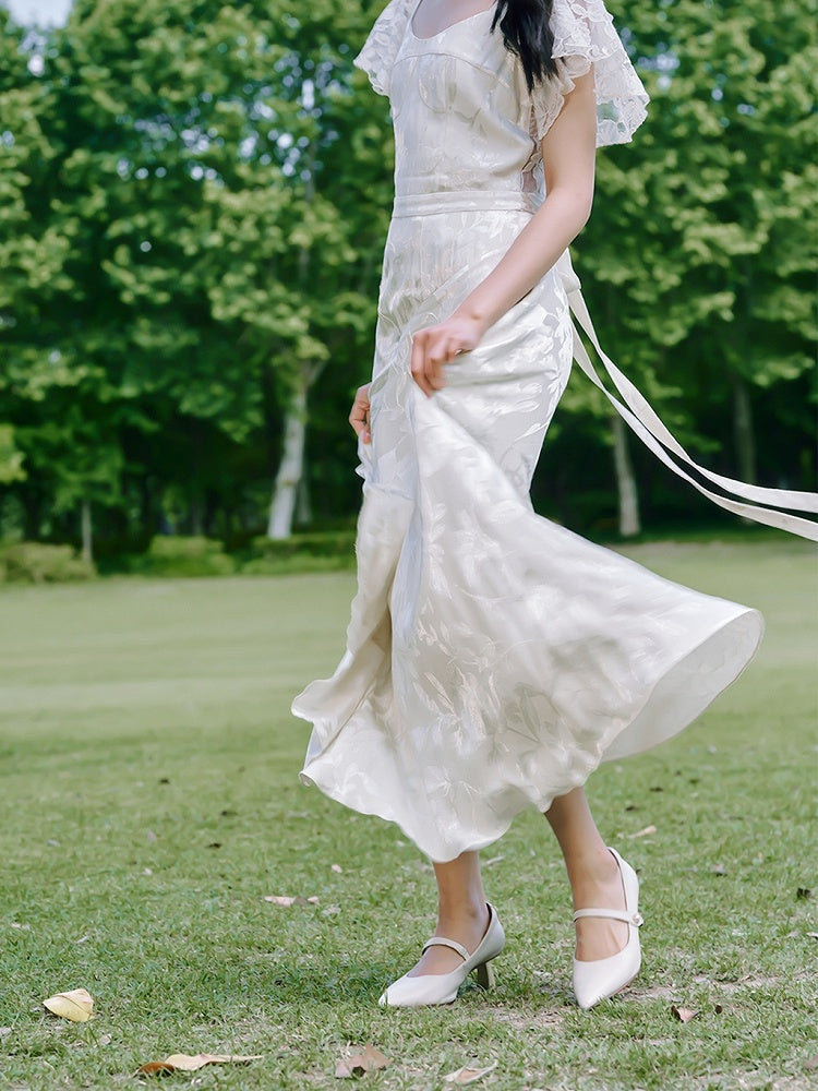Indulge in the exquisite charm of our French lace satin dress, meticulously crafted to highlight your elegance and sensuality. This dress features a sophisticated jacquard design, with sleeves and a back made entirely of delicate lace fabric. The intricate lace not only adds a touch of sophistication but also enhances the dress's alluring appeal. The adjustable tie at the waist allows you to customize the fit to your preference, ensuring comfort and a flattering silhouette. The flowing skirt moves gracefully with every step, embodying a sense of liveliness and romantic sweetness. Perfect for special occasions or a refined evening out, this dress is a timeless addition to your wardrobe. Embrace the essence of delicate romance and sophistication with this stunning piece.