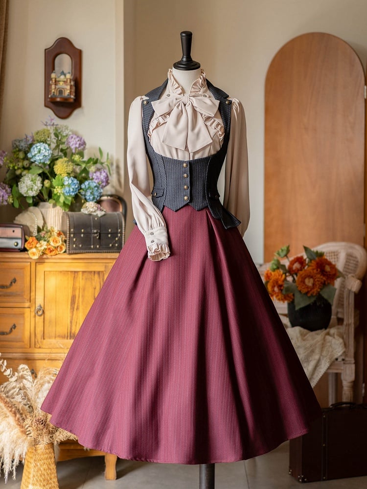 This charming vintage-style striped skirt is designed with a plethora of thoughtful details. It features large pockets on both sides, the side zipper ensures effortless wearing and removal, at the back waist, an elastic band combined with a lace-up offers a customizable and comfortable fit. The waistband is adorned with delicate ruffled edges, while decorative buttons at the waist further elevate its vintage charm. Additionally, the structured boned waist design accentuates the silhouette, creating a flattering and stylish look.