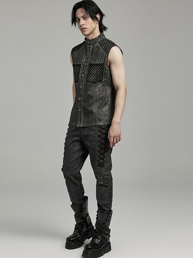 1. Made of distressed abstract printed woven fabric and elastic mesh.