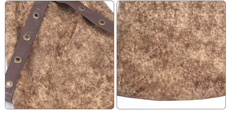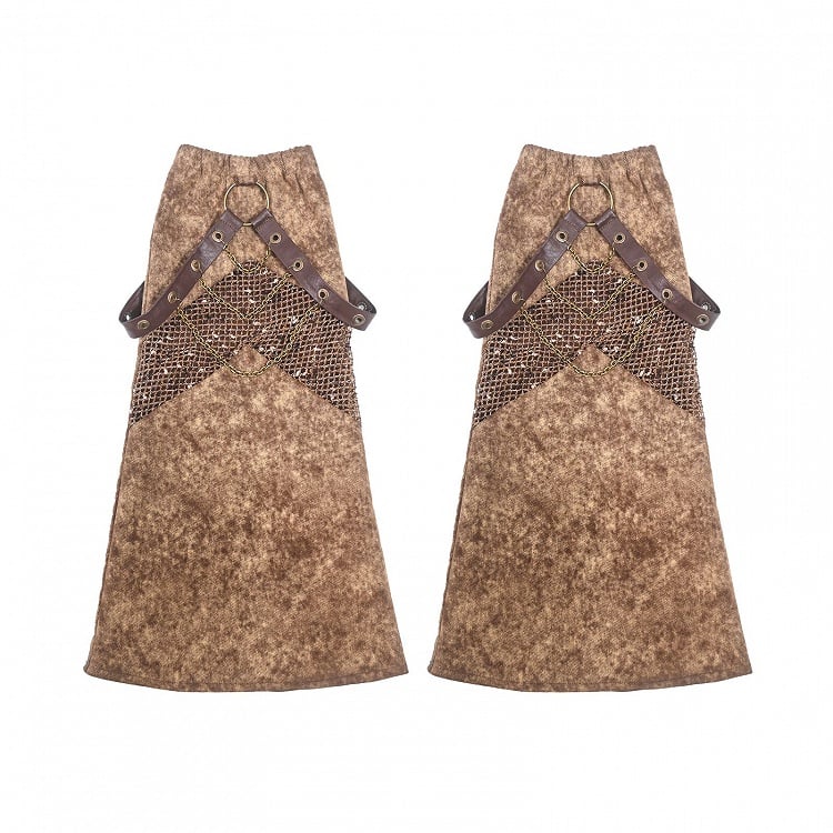 Brown mesh fabric and denim patchwork leg warmers with belt and chain details. Complete your wasteland punk look with this retro vintage leg sleeves.