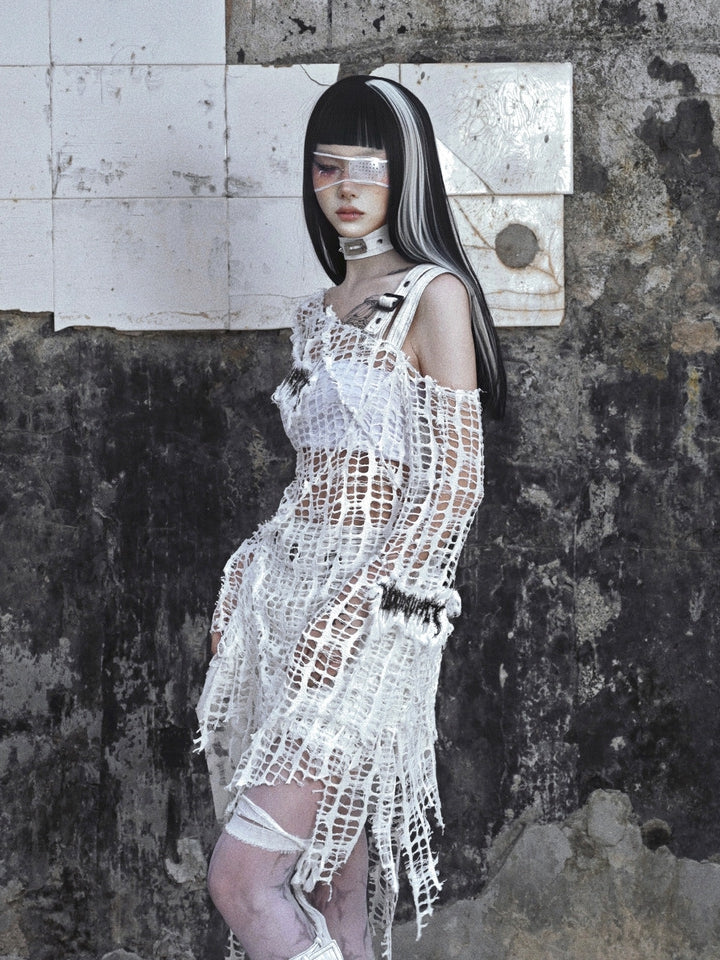 White Bell Sleeves Irregular Distressed Hallow Out Top