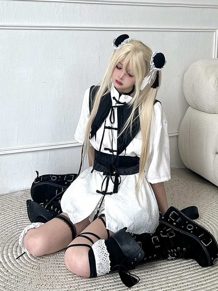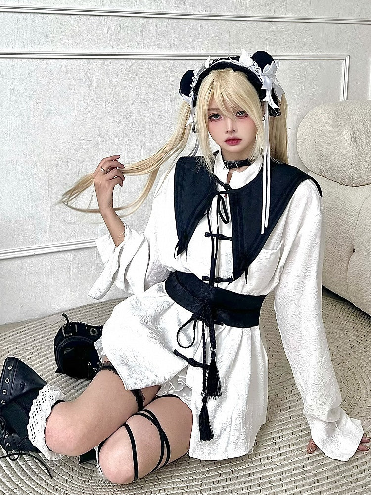 This white cheongsam blouse features a subtle tonal pattern. A detachable collar allows for styling versatility. Traditional frog buttons highlight cultural elegance. Relaxed fit ensures modern comfort. Suitable for both formal and casual wear.