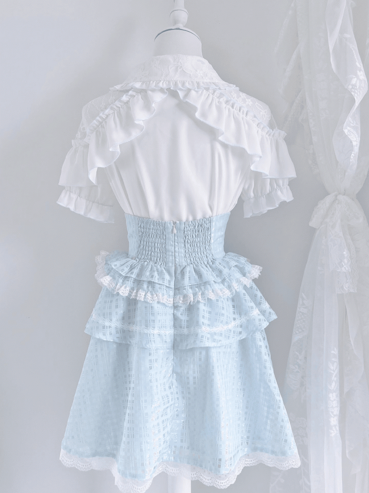 White Open Shoulder Blouse+ Light Blue Lace-up Waist Tiered Skirt+ Bowknots Jirai Kei Set