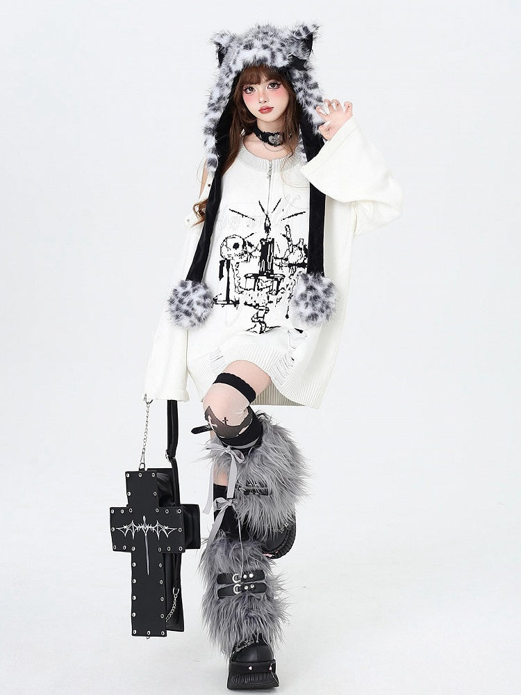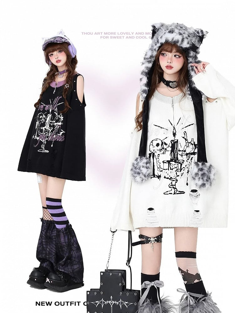 Unleash your inner rebel with this White Punk Cutout Shoulder Distressed Sweater. The sweater features strategically placed cutouts on the shoulders. The distressed detailing throughout the fabric adds a rugged, worn-in charm. Accentuated with metal studs, this sweater doesn't just rely on its cuts and tears for attitude. The zip closure adds a unique touch while ensuring a comfortable fit.