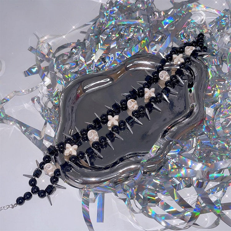 White Punk Skulls and Crosses Black Beads Studs Choker