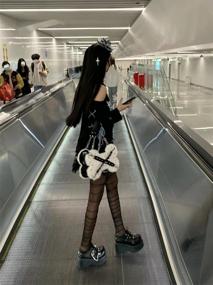 Adding to its distinctive look, two black studded straps crisscross over the bag, secured by metallic clasps, while additional studs are stylishly distributed across the surface, enhancing its punk-inspired aesthetic.