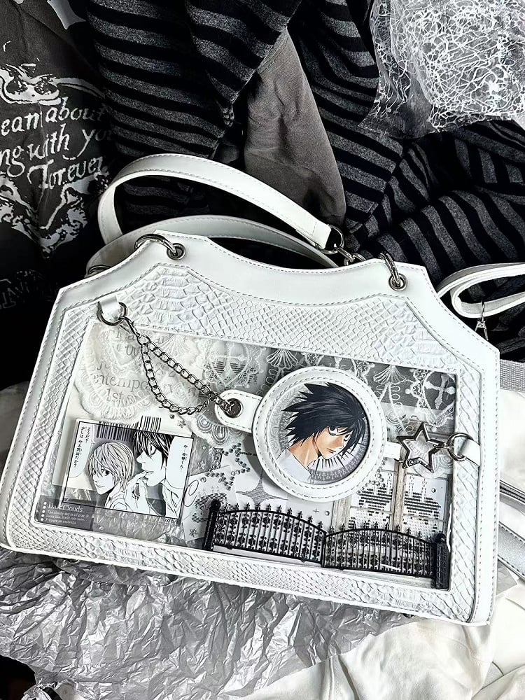 This elegant White PU Ita Shoulder Bag is a perfect blend of style and functionality for any kawaii fashion enthusiast. Crafted from high-quality PU leather, it offers durability and a sleek look. The bag features a transparent window for displaying your favorite pins, keychains, or small accessories, allowing you to personalize and showcase your unique style. Its spacious interior is ideal for carrying daily essentials.Whether you're heading to a convention, a casual outing, or just want to add a touch of adorable charm to your outfit, this ita bag is a must-have accessory for any kawaii lover.