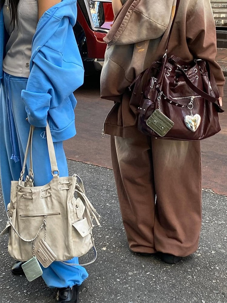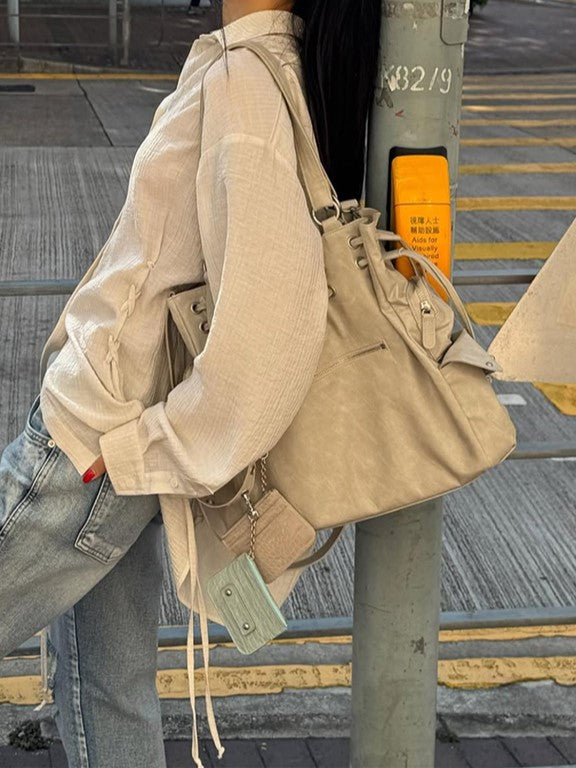Elevate your style with this versatile white tote. Crafted from soft material, it features a unique single-shoulder design with dual short straps and an adjustable long crossbody strap. Edgy studs and hanging strings add a rebellious touch. Spacious and practical, it’s perfect for everyday elegance.