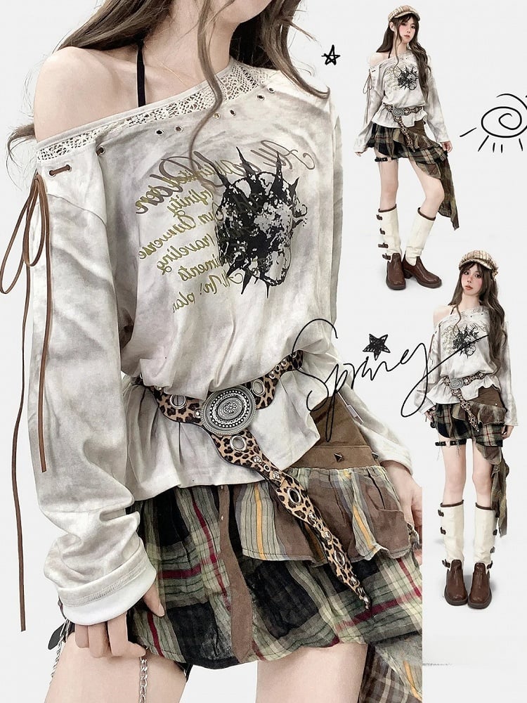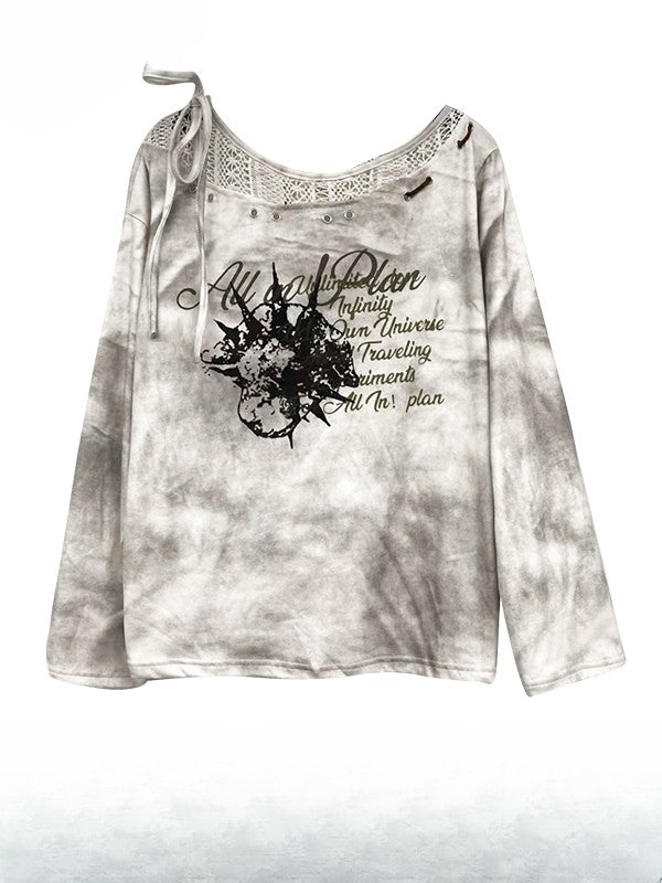 White Wasteland Punk Letter Print Self-tie Strap Tie Dye Design Sweatshirt