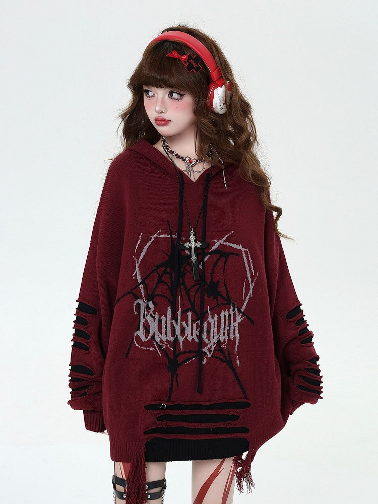 Wine Red Gothic Spiderweb Distressed Holes Hooded Sweater