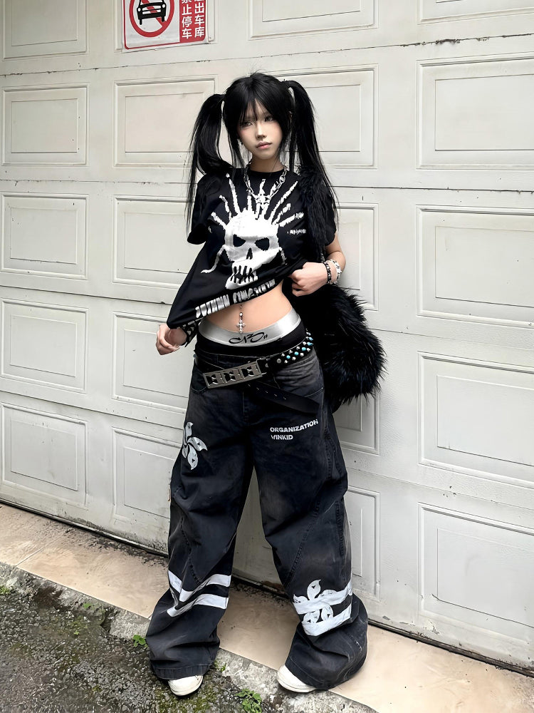 Y2K Black Round Neck T-shirt with Silver Foil Skeleton Print