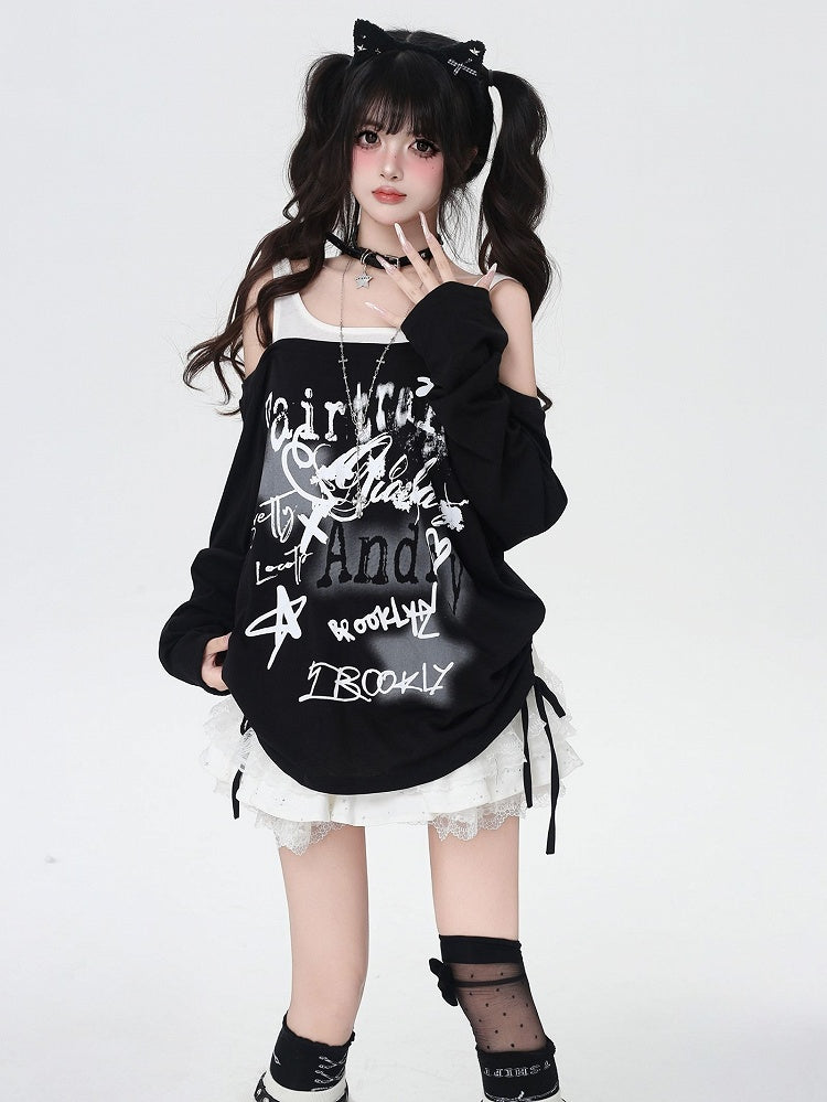 Y2K Star Print Open Shoulder Black/White Top Faux Two-pieces